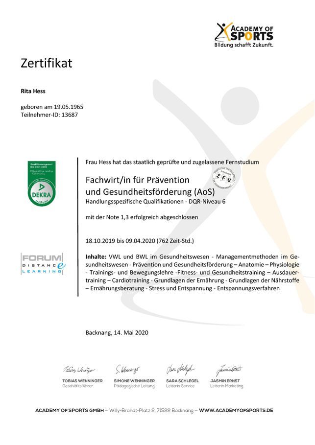 Regelmäßiger Sport und eine gesunde Ernährung sind seit jeher zentrale Bestandteile meines Lebens. Diese Prinzipien verfolge ich nicht nur persönlich, sondern gebe sie auch mit großer Überzeugung an meine Teilnehmer weiter. Mit meiner Qualifikation als Fachwirtin für Prävention und Gesundheitsförderung, Betriebliche Gesundheitsmanagerin sowie meinen akademischen Abschlüssen im Bereich Gesundheitsmanagement fühle ich mich hervorragend vorbereitet, um im Bereich der Prävention tätig zu sein und meine Expertise weiterzugeben.